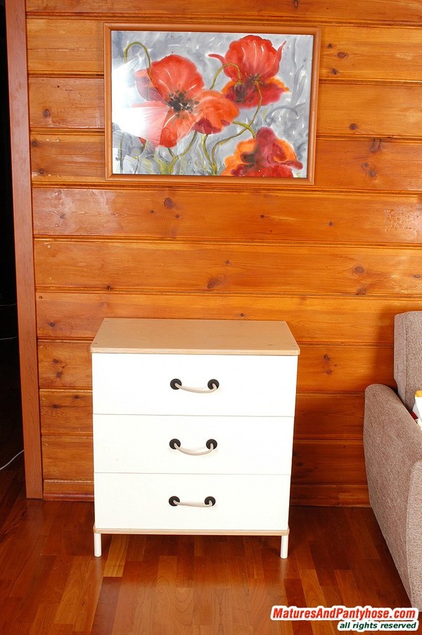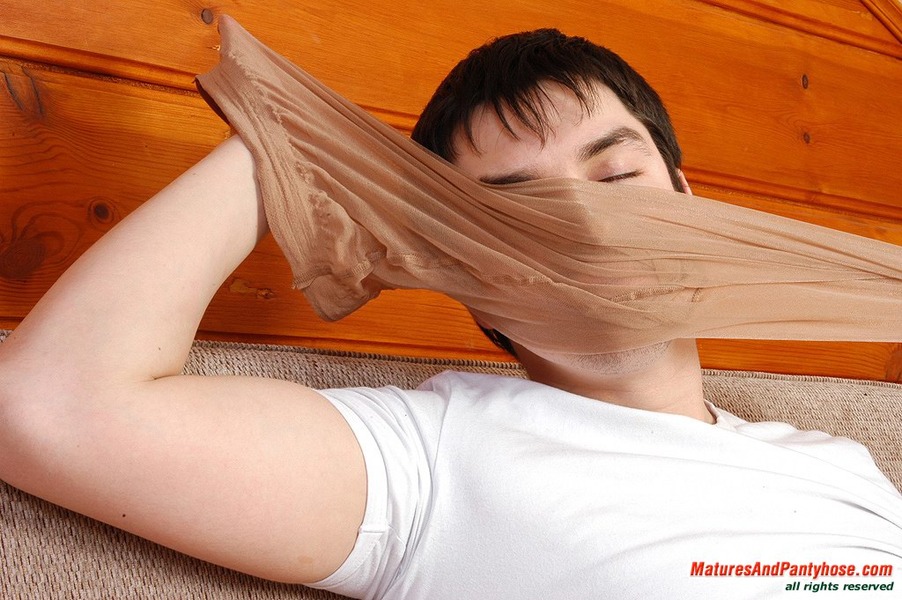 Lustful mature chick in smooth tights devouring well-hung guy with her eyes