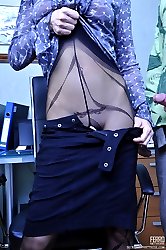 Raunchy secretary in open crotch fashion hose gets fucked for a big cumload