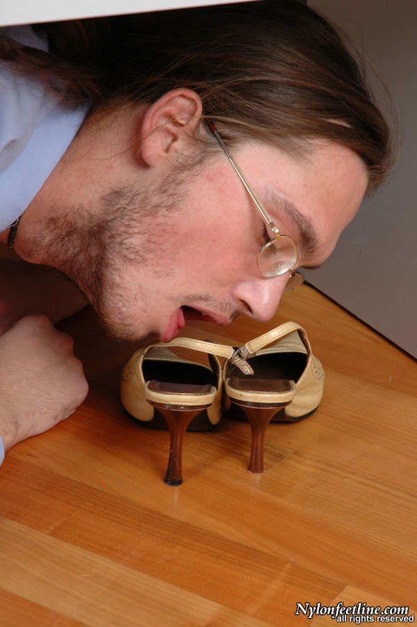 Freaky guy jerking off with stiletto heel shoes before licking nyloned toes